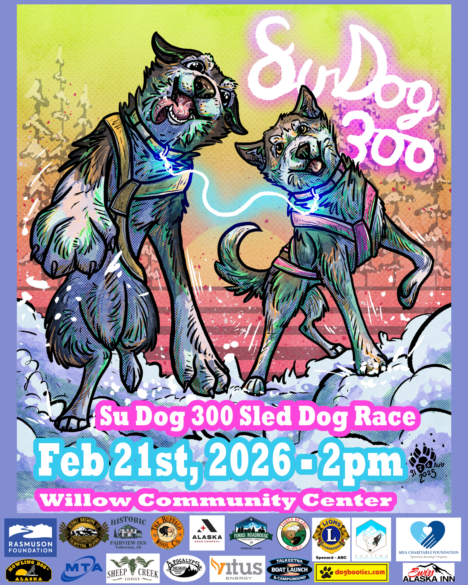 Please join us in celebrating the return of a 300 mile sled dog race to the Upper Susitna Valley, the Su Dog 300! The Susitna Valley is home to the beginning of the Iditarod trail and countless sled dog kennels, this area is a hub for mushing and keeping the history of Alaska’s sled dogs relevant in a modern world. The Su Dog 300 is focused on creating a fun and educational event for dogs, dog mushers, and fans alike to experience the beauty of this area and the magic of sled dogs in their element.